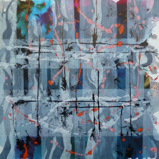 Abstract schilderij, olieverf en inkt op linnen.